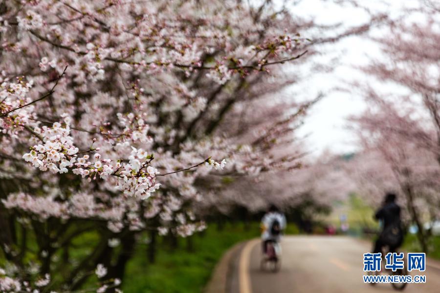 春季里,貴州省貴安新區紅楓湖畔的櫻花園內櫻花綻放,花海如云似雪,吸引游人踏春賞櫻。