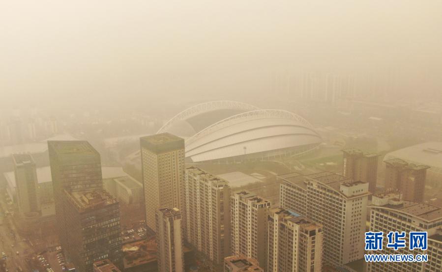 這是3月15日拍攝的遼寧省沈陽市奧體中心體育場(無人機照片)。當日,我國北方多地出現沙塵天氣。新華社記者 楊青 攝