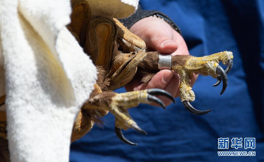 這是3月20日拍攝的佩戴在一只大鵟腳上的環志。新華社記者 陳鐘昊 攝