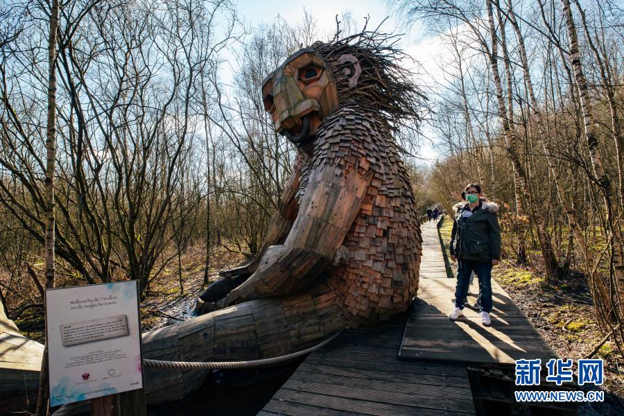 3月20日,人們在比利時博姆市的德舒爾森林公園觀賞一座“巨人”雕塑。新華社記者 張鋮 攝