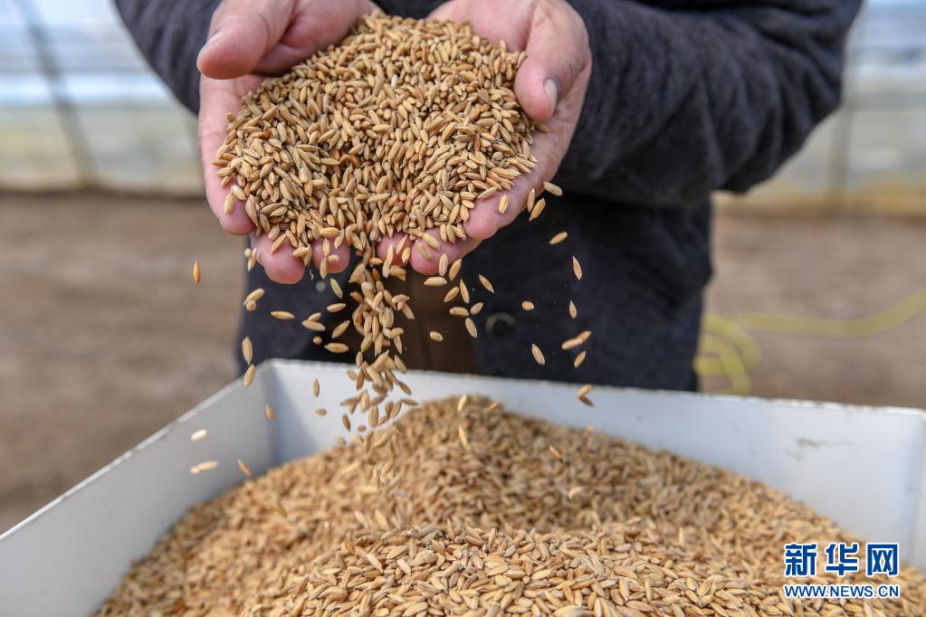 在吉林省吉林市永吉縣九月豐家庭農場,負責人肖建波將水稻種子倒入育秧機(4月13日攝)。新華社記者 張楠 攝