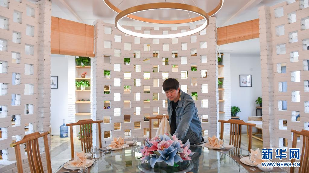 在吉林市船營區大綏河鎮,創業者曹曦在民宿餐廳內擺放餐具(4月20日攝)。新華社記者 張楠 攝