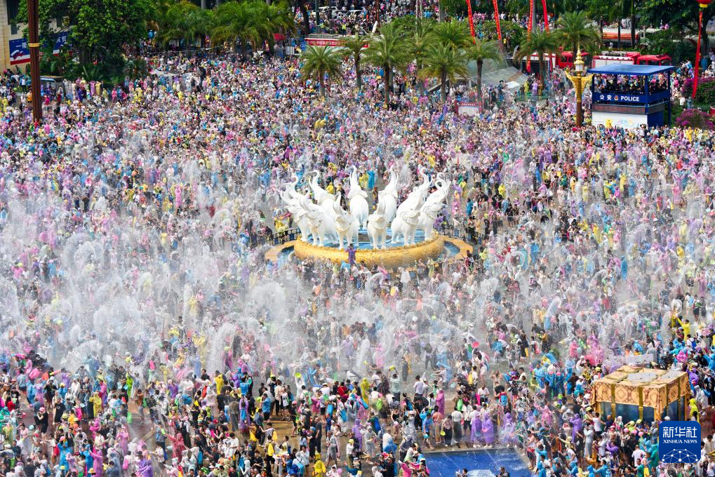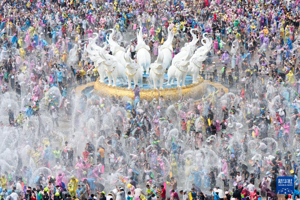 4月15日,人們在云南省西雙版納傣族自治州景洪市潑水廣場潑水狂歡。