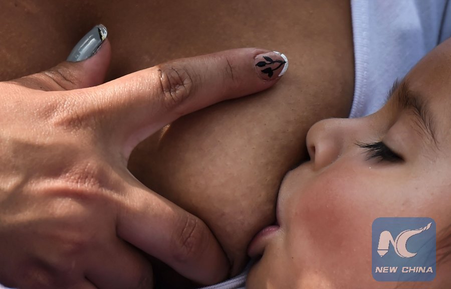 A woman breastfeeds her baby during a public event to promote the benefits of breastfeeding at a park in Bogota on Nov. 3, 2017. (Xinhua/AFP)
