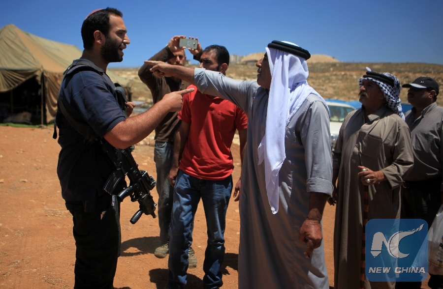 File Photo: A Palestinian argues with an Israeli soldier during a protest against a new Jewish settlement outpost near the West Bank City of Hebron, on July 1, 2018. (Xinhua/Mamoun Wazwaz)