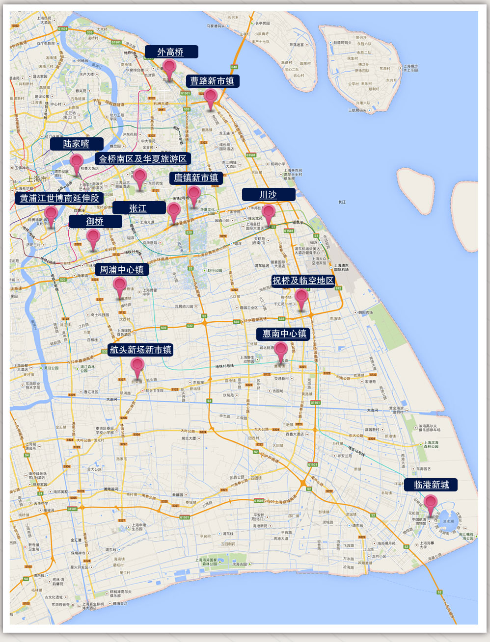 西起外環線,東至海濱,南起張家浜和浦東運河、合慶鎮界,北至五洲大道,面積45平方公里。以大學城、總部基地和市區人口外遷為依托,結合交通樞紐和濱海生態產業地帶的建設,規劃為金橋功能區域的東片主體。?