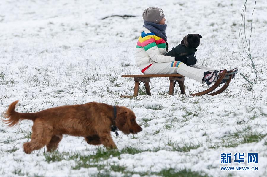 1月24日,在英國倫敦,一名兒童抱著小狗坐在雪橇上。新華社記者韓巖攝