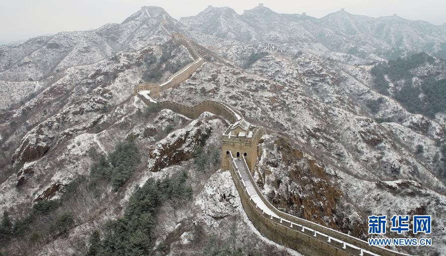 這是2月23日拍攝的金山嶺長城雪景(無人機照片)。受冷空氣影響,河北省承德市灤平縣當日出現降雪天氣。雪后的金山嶺長城銀裝素裹,美如畫卷。新華社發(王立群 攝)