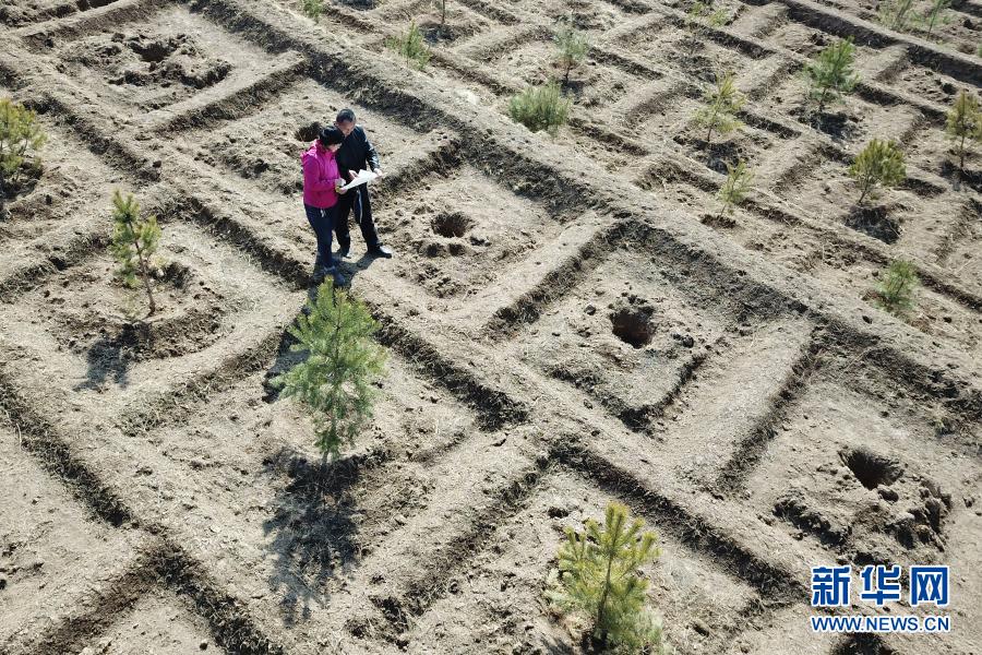 3月11日,在平涼市崆峒區白水鎮焦莊村北山,張文玉(左)和同事討論植樹造林細節(無人機照片)。