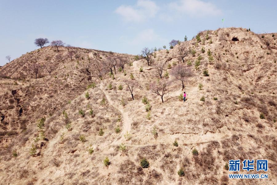 3月11日,在平涼市崆峒區白水鎮焦莊村北山,張文玉在山坡上查看栽植的油松(無人機照片)。