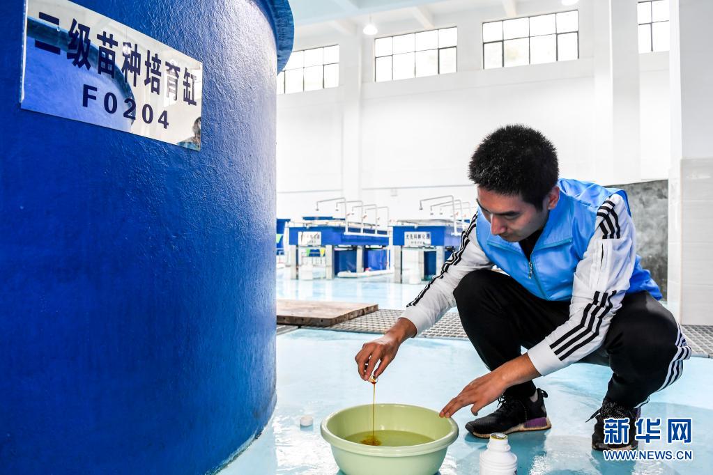 4月20日,大藤峽魚類增殖放流站的工作人員在配制營養液。