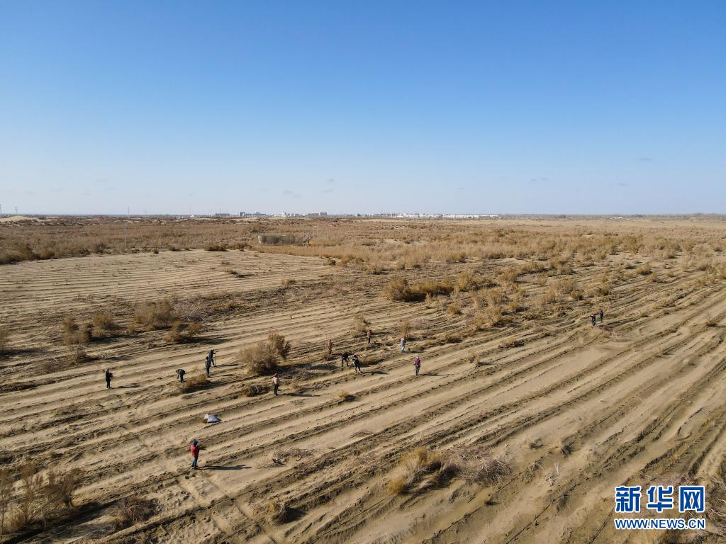 群眾在離且末縣不遠的沙地里種植梭梭(4月1日攝,無人機照片)。新華社記者 高晗 攝