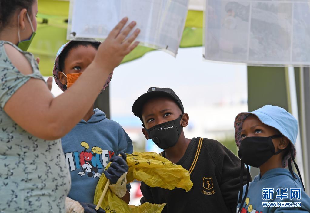 4月22日,南非比勒陀利亞的志愿者向小朋友們介紹環保知識。