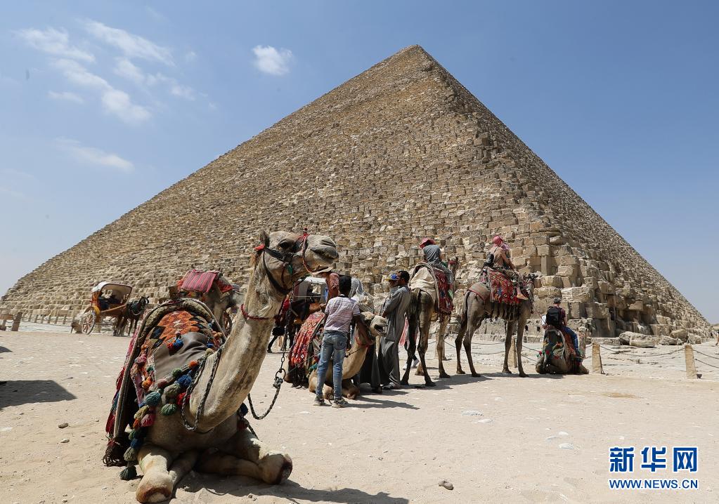 4月26日,游客在位于埃及吉薩省的金字塔群景區乘坐駱駝游玩。