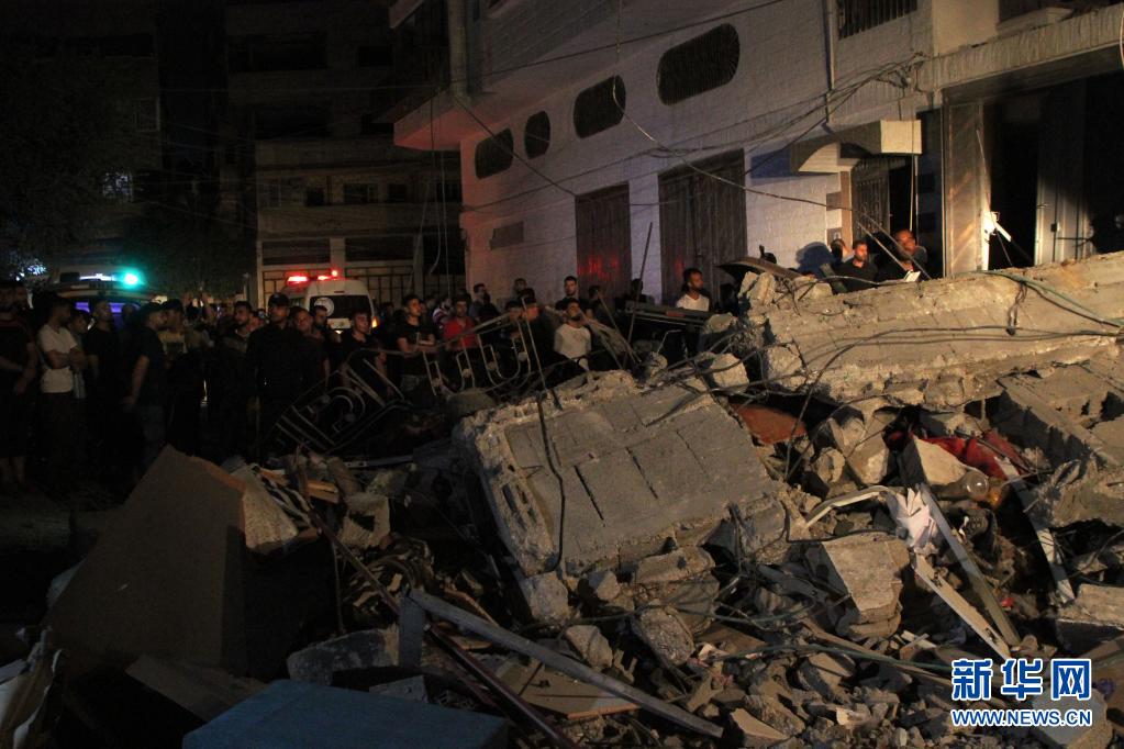 5月15日,人們聚集在加沙城一處遭空襲的難民營。