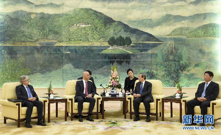 ??? 9月30日,國務院副總理馬凱在北京人民大會堂會見來訪的瑞士聯邦委員兼內政部長阿蘭·貝爾塞一行。 新華社記者 張鐸 攝