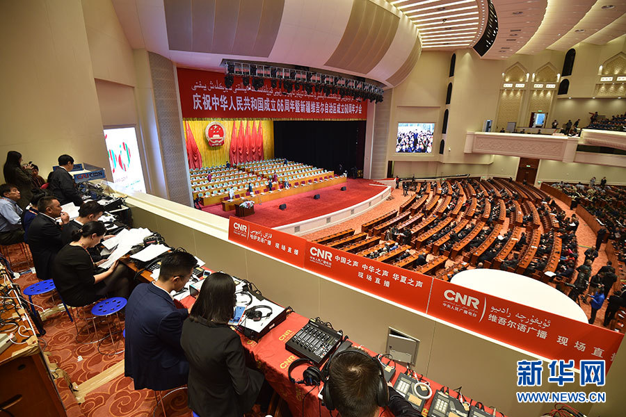 10月1日,慶祝中華人民共和國成立66周年暨新疆維吾爾自治區成立60周年大會在新疆人民會堂舉行。圖為媒體工作人員在做會前準備工作。新華網記者 郭小天 攝
