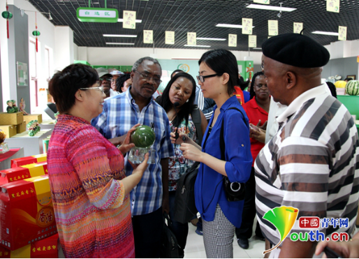 馮樂平(左一)介紹西瓜工藝品。本人供圖