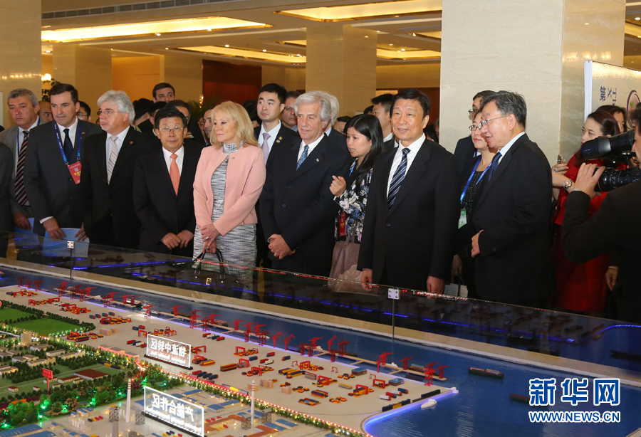 10月14日,中國國家副主席李源潮在河北唐山與參加第十屆中國-拉美企業家高峰會的烏拉圭總統塔瓦雷·巴斯克斯共同巡視中拉產能合作展覽會。這是李源潮與巴斯克斯參觀曹妃甸產業園沙盤。新華社記者楊世堯攝