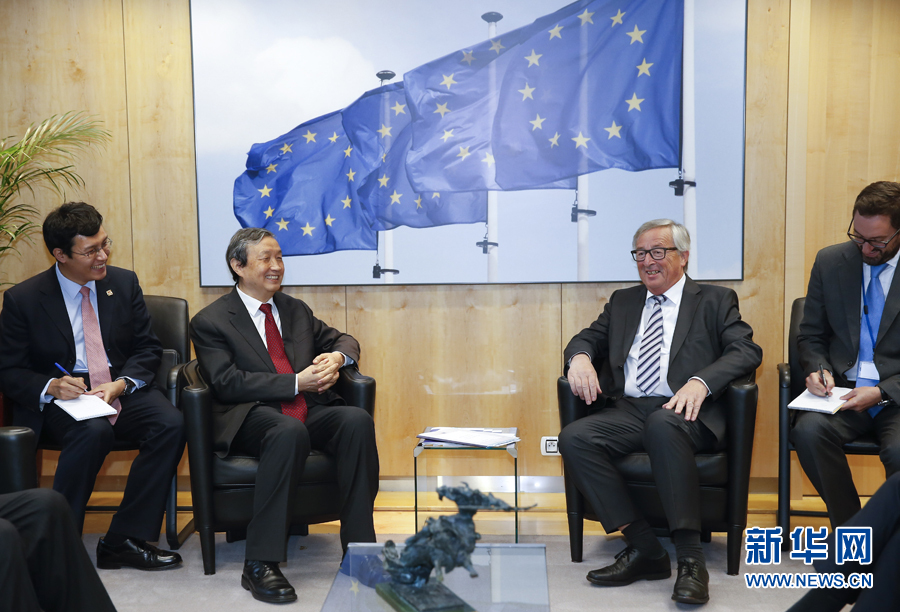 10月18日,在比利時首都布魯塞爾歐盟委員會總部,出席第六次中歐經貿高層對話的國務院副總理馬凱(左二)會見歐盟委員會主席容克(右二)。新華社記者葉平凡攝