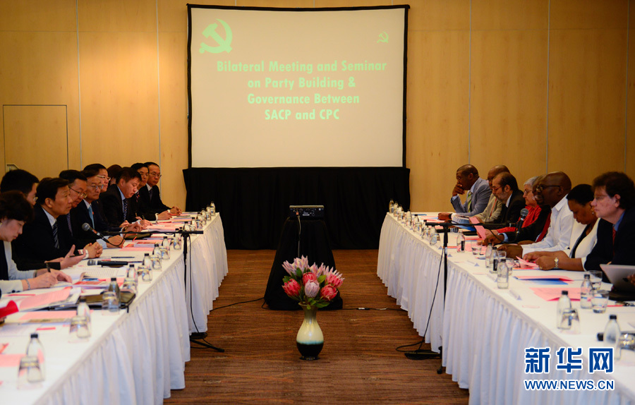 ??? 11月22日,中共中央政治局委員、國家副主席李源潮(左三)在南非開普敦會見南非共產黨第二副總書記索利·馬派拉(右三)。新華社記者翟健嵐攝