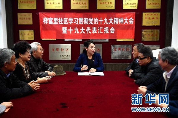 10月26日,陳林靜(中)在祥富里社區為居民宣講黨的十九大精神。新華社記者 王曉 攝