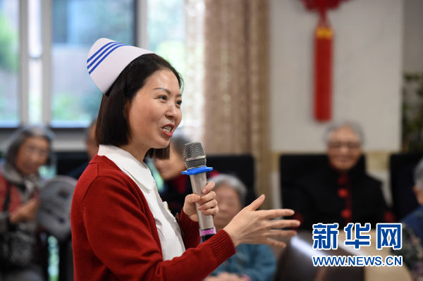 在重慶市青杠老年護養中心,趙慶華像拉家常一樣,給老人們講起十九大精神(11月1日攝)。新華社記者 唐奕 攝