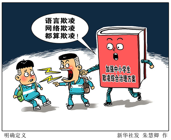 教育部教育督導局局長、國務院教育督導委員會辦公室主任何秀超介紹,在11部門聯合印發的方案中,首次對學生欺凌作出明確界定,指出中小學生欺凌是發生在校園內外、學生之間,一方單次或多次蓄意或惡意通過肢體、語言及網絡等手段實施欺負、侮辱,造成另一方身體傷害、財產損失或精神損害等的事件。