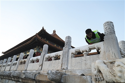 單霽翔此次主要檢查故宮最重要的三大殿區域。昨日下午6時許,所有檢查完畢后,一扇扇宮門關閉。(記者 倪偉)