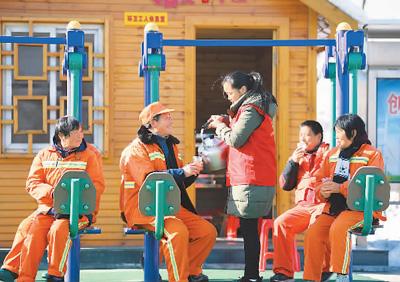 圖為一月十日,安徽省肥西縣環衛工人在“愛心小屋”前喝熱水、曬太陽。新華社記者 劉軍喜攝
