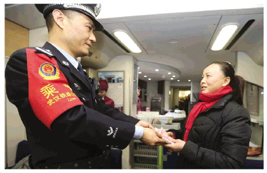 圖為武漢鐵路公安局武漢公安處乘務二大隊乘警魏國強(左)將找到的遺失錢財交給失主。趙軍 攝