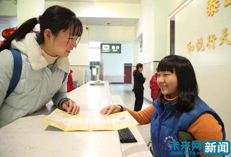 由于李厚萱行動不便,志愿服務期間她的母親田秀云全程陪同。李厚萱在咨詢臺工作的時候,閑下來的田秀云便幫忙整理、分發列車時刻表,是泰山火車站“特殊”春運志愿者。