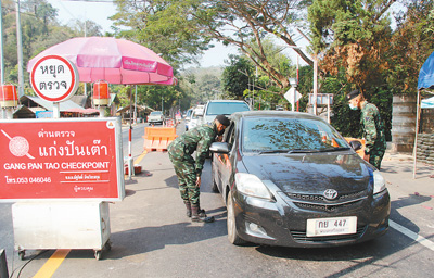 在距離泰緬邊境約40公里的格班丹檢查站,幾名警察在細致地檢查一輛越野車,緝毒犬也跳上車子,把車輛內外嗅了個遍。檢查站旁沙袋堆壘的掩體內,全副武裝的士兵警惕地注視著周邊茂密的叢林。