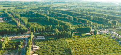 1986年,地委下定決心,在風沙策源地柯柯牙啟動綠化工程。30多年來,克服重重困難,先后組織近210萬人次,進行37次綠化造林大會戰,筑起了一條集生態林、經濟林于一體的防風治沙“綠色長城”。亙古荒原、風沙之源,變成了生態屏障、綠洲果園。