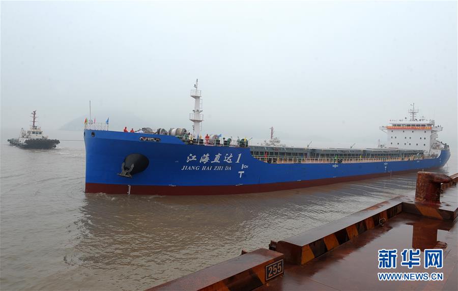 4月5日下午,“江海直達1”號在拖船的協助下駛離浙江省舟山市鼠浪湖礦石中轉碼頭,首航安徽馬鞍山。新華社發(吳琳紅 攝)