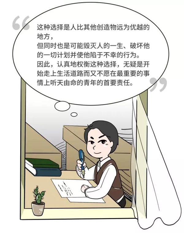 “這種選擇是人比其他創造物遠為優越的地方,但同時也是可能毀滅人的一生、破壞他的一切計劃并使他陷于不幸的行為。因此,認真地權衡這種選擇,無疑是開始走上生活道路而又不愿在最重要的事情上聽天由命的青年的首要責任?!?/p>