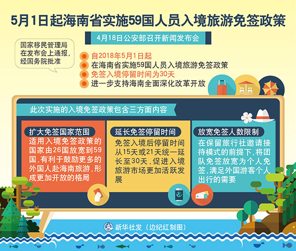 新華社北京4月18日電(記者 劉奕湛、丁小溪)公安部18日召開新聞發布會,國家移民管理局在發布會上通報,經國務院批準,自2018年5月1日起,在海南省實施59國人員入境旅游免簽政策,免簽入境停留時間為30天,進一步支持海南全面深化改革開放。