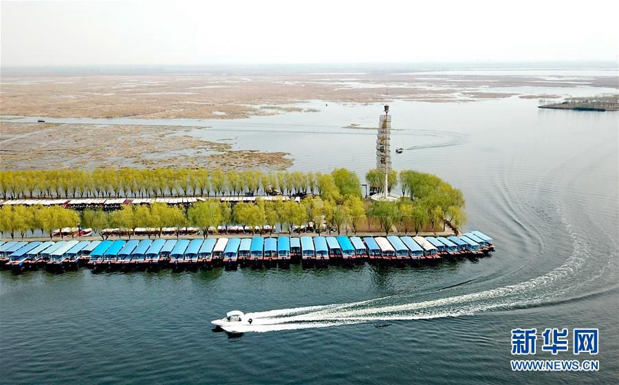 一艘游船在白洋淀景區旅游碼頭內行駛。新華社記者 牟宇 攝