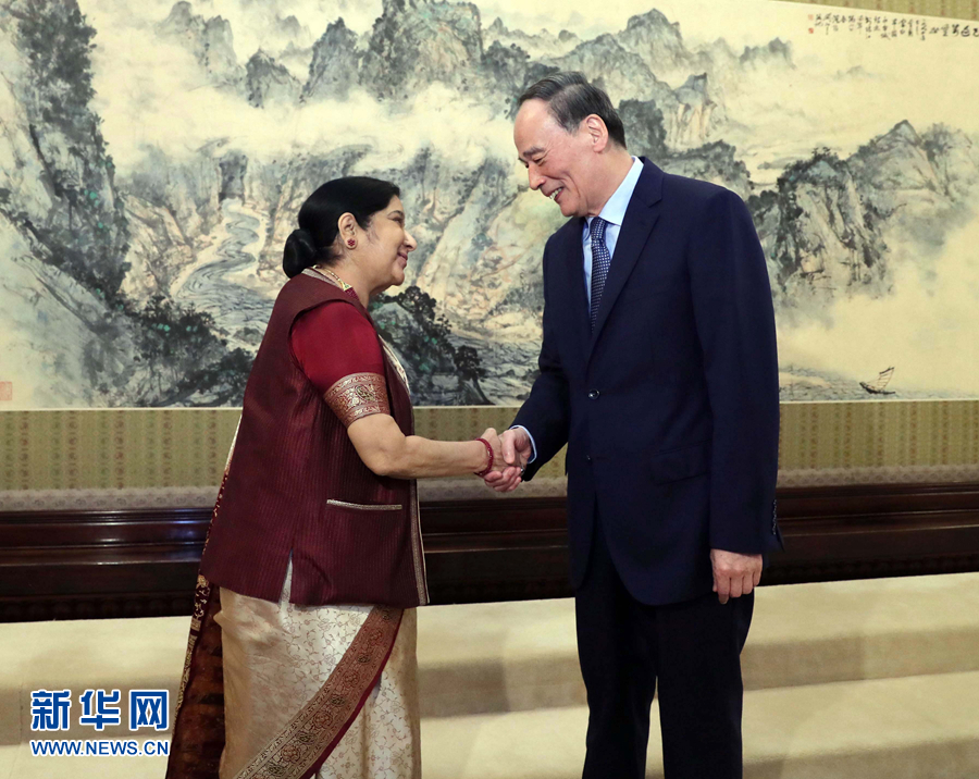 4月23日,國家副主席王岐山在北京中南海會見印度外長斯瓦拉杰。新華社記者劉衛兵攝