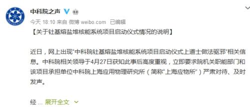 近日,網上出現“中科院釷基熔鹽堆核能系統項目啟動儀式上道士做法驅邪”相關信息。中科院相關領導于4月27日獲知此事后高度重視,立即要求院機關職能部門和該項目承擔單位中科院上海應用物理研究所(簡稱“上海應物所”)嚴肅對待、及時發聲。