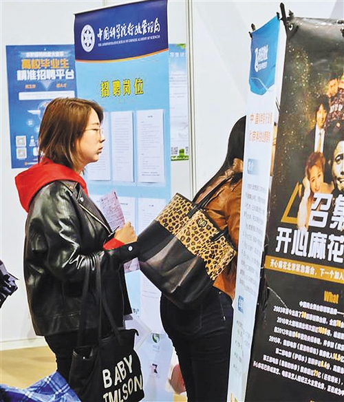 在招聘會現場,身著正裝的周源走走轉轉,仔細閱讀著用人單位的招聘海報。作為一名中文系碩士應屆畢業生,周源手里已經有了好幾份錄取通知書,她仍然顯得有點焦慮。還有2個多月就要畢業了,是回老家沈陽還是留在北京,她坦言還沒有想好?;氐嚼霞译x父母更近一些,在大城市里發展機會更多,究竟如何取舍,她遲遲做不出決定。