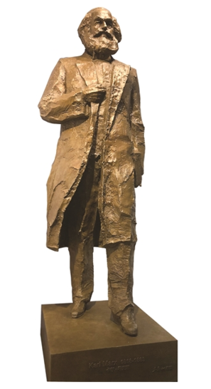 展廳入口處,一尊兩米多高的馬克思雕像,仿佛迎面向觀眾走來。這座由著名雕塑家、中國美術館館長吳為山創作的雕塑,栩栩如生地展現了馬克思的音容笑貌——目光深邃、從容淡定,傳遞著堅定前行的力量。