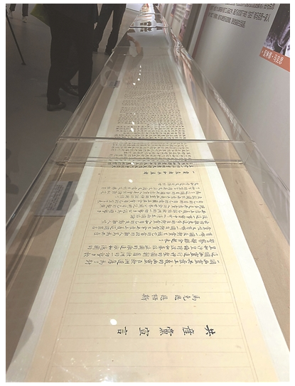 展廳中,一幅由5位江蘇書法家集體創作的22米長的《共產黨宣言》書法長卷,展示著《共產黨宣言》震撼人心的力量,同樣吸引了不少觀眾的目光。這幅小楷長卷有近一萬五千個漢字,由江蘇書法家孫曉云、王衛軍、謝少承、張守躍、黃繼革聯合創作,在氣勢恢宏中傳遞著中華傳統書法的優美。據悉,這也是國內首次以中國傳統書法藝術形式詮釋馬克思主義經典著作。