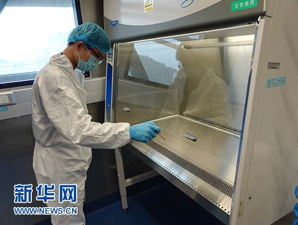中國科學院武漢病毒研究所暖通設備工程師王亮在武漢P4實驗室測試設備(資料照片)。 新華社發