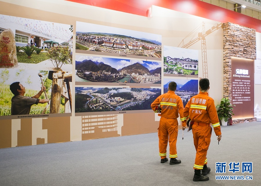 5月10日,兩名消防人員在成就展上參觀。當日,“5·12汶川特大地震災區發展振興成就展”在成都正式開展。該展覽用300余張照片、130余件套實物,全方位展示了汶川地震災區十年來發展振興所取得的歷史成就和城鄉面貌變化。新華社記者 張帆 攝