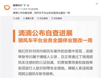 同日,滴滴公布鄭州順風車案自查進展,順風車平臺業務全國停業整改一周。