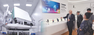 圖左為維信諾(固安)第六代全柔AMOLED生產線智能車間,圖右為維信諾總裁張德強博士(左一)介紹柔性屏產品終端應用。資料圖片 制圖:張丹峰