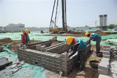 昨日,廣渠路快速公交系統工程正式開工建設,工人在現場施工作業。新京報記者 王貴彬 攝