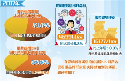 服務業是現代化經濟體系建設的關鍵領域。統計數據顯示,2017年,服務業增加值占全國GDP比重為51.6%,連續5年在三次產業中領跑,服務業增長對國民經濟增長的貢獻率為58.8%,拉動全國GDP增長4.0個百分點。