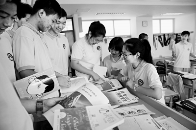 高考臨近,北京市二中高三年級同學在完成高三學年最后一堂課后,將清理出來的多余的復習叢書送給了高二年級的學弟學妹們。周良 攝
